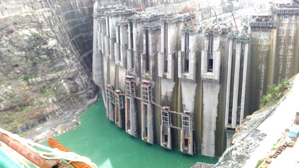 溪洛渡水電站位于四川省雷波縣和云南省永善縣接壤的金沙江峽谷段,是金沙江水電基地下游四個巨型水電站中最大的一個,以發電為主,兼有攔沙、防洪和改善下游航運等綜合效益的大型水電站。溪洛渡水電站樞紐由攔河壩、泄洪、引水、發電等建筑物組成。攔河壩為混凝土雙曲拱壩,壩頂高程610米,最大壩高278米,壩頂弧長698.07米;左、右兩岸布置地下廠房,各安裝9臺水輪發電機組,單機容量77萬千瓦,電站總裝機1386萬千瓦,多年平均發電量571.2億千瓦時。裝機容量與原來世界第二大水電站——伊泰普水電站(1400萬千瓦)相當,是中國第二、世界第三大水電站。
