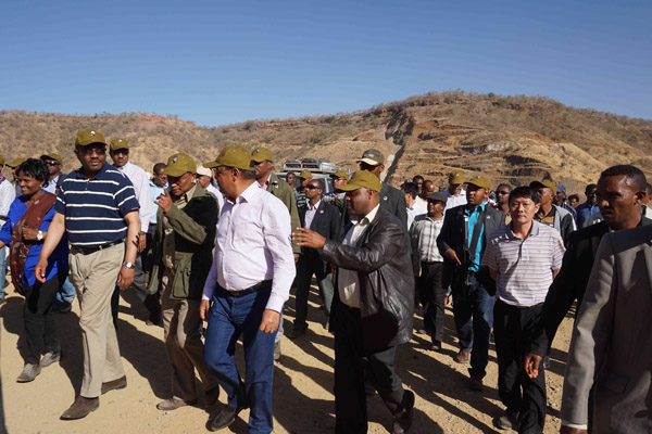 下午3時許,總統、總理和議長抵達工地后,就頂著40度的高溫馬不停蹄趕往主壩和灌溉隧洞引水渠,詳細視察現場情況。承包商Sur公司負責人Tadesse Yemane向三位領導報告了工程概況和現場進度,并介紹了整個大壩防滲的關鍵部分——基礎灌漿和瀝青混凝土芯墻——是由江西水建承建的。公司項目經理黃生寶向三位領導簡要匯報了灌漿項目的完成情況,并表達了又好又快完成瀝青混凝土芯墻和灌溉隧洞的堅定決心和信心。領導們對我公司的成績表示肯定,希望我們再接再厲、優質高效地完成接下來的工作,為早日實現蓄水和灌溉做出努力。