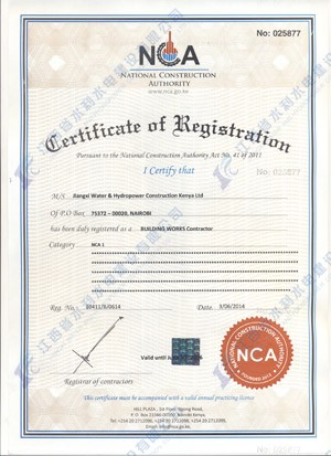 2013年3月份,肯尼亞國家建筑局(National Construction Authority)發出公告,要求所有在肯尼亞的建筑企業,必須在肯尼亞建筑局注冊登記,提交相關資料,評出公司資質等級。