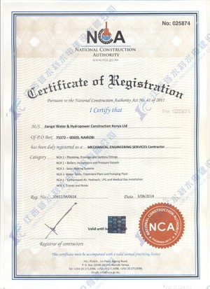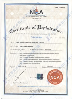 江西省水利水電建設有限公司肯尼亞分公司接到通告后,積極準備相關資料,憑借公司的技術實力和肯尼亞市場的良好業績,最終取得所有六項的一級證書。其中包括:水利施工一級,公路工程施工一級,房屋建筑工程施工一級,結構施工一級,電力工程施工一級和機電工程施工一級,有力地提升公司的品牌影響,提升了公司資信競爭力,為公司在肯尼亞各項工作的全面深入開展創造了積極有利的條件。
