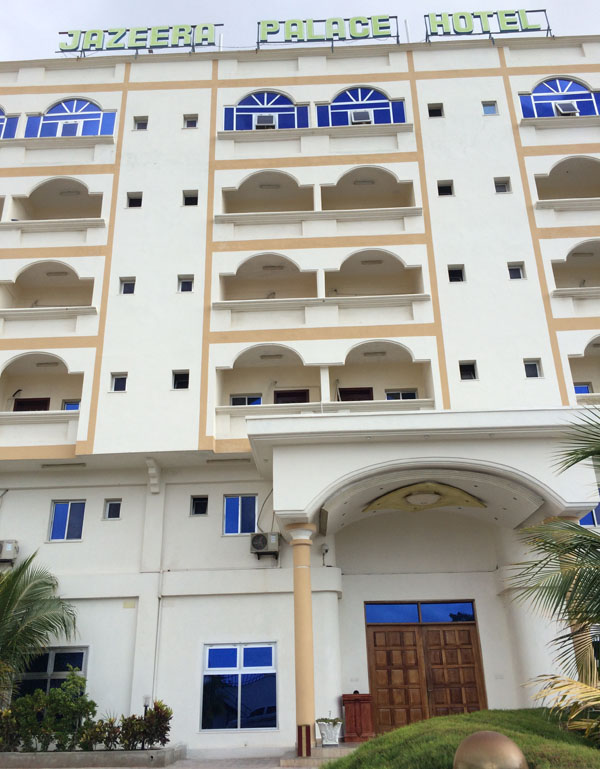 我們入住的是半島皇宮酒店,也是中國駐索使館的臨時辦公產所。三道門的安全防護可謂警備森嚴,戰爭國家的氣象從這可見一斑。酒店內布置簡單,但設施齊全,與酒店外充滿殺氣的氣氛不同,酒店內人來人往,商人喝著咖啡悠閑地談著生意。我們也坐著邊喝咖啡邊商談工作計劃,不時有索馬里人來打招呼,用中文說“你好”,并客氣地握手表示熱情歡迎來到摩加迪沙。